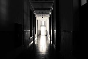She pulled even harder. The door did not move. She put her whole weight on the door, staring at the end of the corridor hard, as if that would make her stronger or ease the pain on her hands. A gust of cold wind blew onto her cheeks. She opened her eyes wide, but suddenly, it seemed, there was something in the darkness. She searched in the darkness for the same color and contour that she just saw, and there, at the end of the corridor, was a lump of shadow, shadow with a dark color, much darker than its surrounding area. She widened her eyes in horror, with her sudden realization that it was a silhouette, a still silhouette of a woman. Restraining herself from screaming, she immediately fumbled for the light switches on her right. Click click. Lights were on, nothing was there. “Ah.” She felt a sense of relief. Out of pure curiosity, she turned the lights back off. Click. The shadow was still there. Her heart tensed again. Click. Lights on, nothing. Click. Lights off, the shadow appeared. She fiddled the switch for a few times, started to feel bored and turned the lights off the last time, deciding to go to bed. Click. The shadow was not there. She searched for the shadow again and again at the end of the corridor, and in a sudden, she saw it.